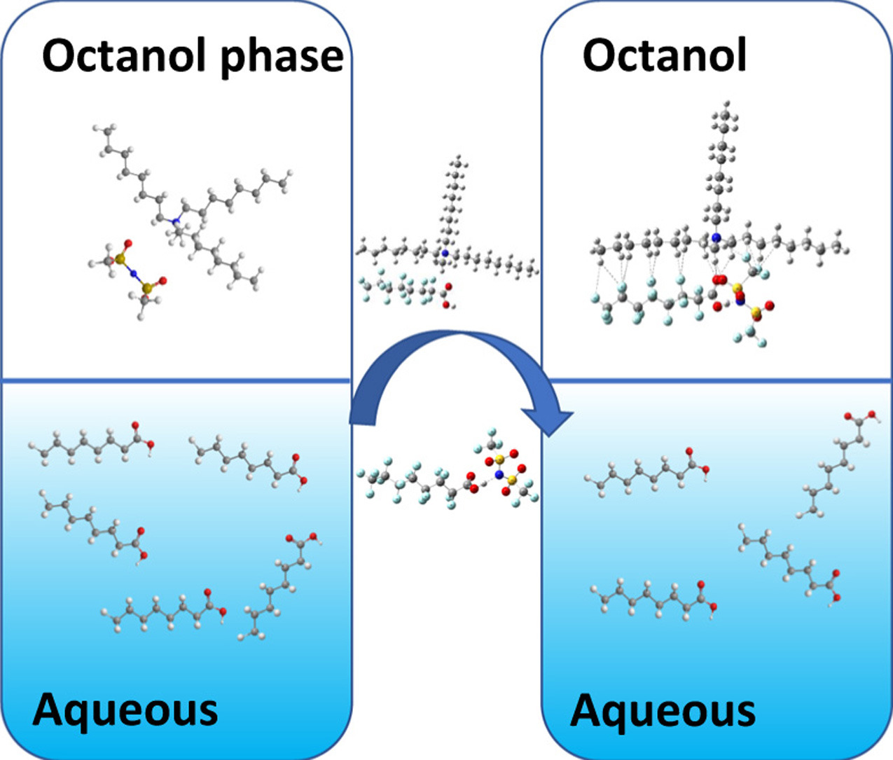 24Extraction of PFOA from dilute wastewater using ionic liquids that are dissolved in N-octanol. Journal of hazardous materials [link]
